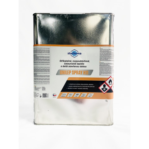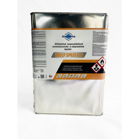 UNILEP SPRAY H22, striekacie, rozpúšťadlové, autočalunícke nábytkárske lepidlo. Lepí PUR peny, textil, kožu, pryž, drevo, dýhu, ABS, PVC a melamínové fólie a koženku. Vhodné hlavne na autočalunícke práce, dýhovanie zakrivených plôch a postforming. Teplotná odolnosť spoja (bez tužidla) do 90°C, s tužidlom do 120°C.