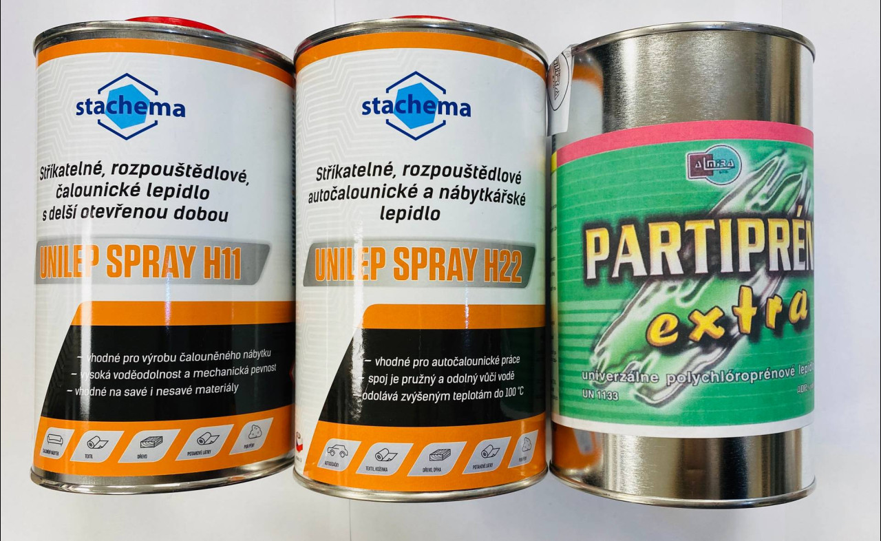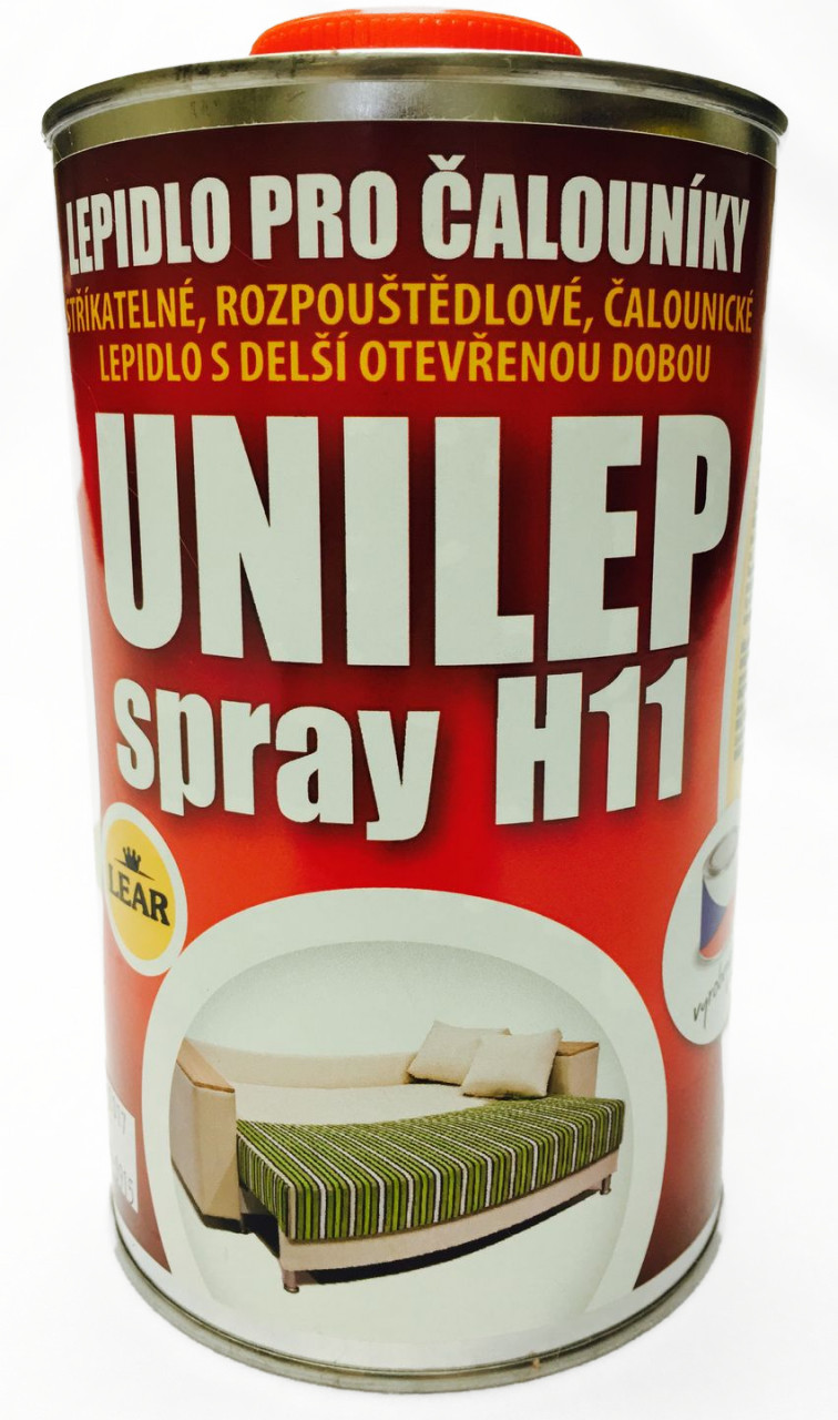 UNILEP SPRAY H11, striekacie, rozpúšťadlové, čalunícke lepidlo s dlhšou otvorenou dobou. Používa sa na lepenie PUR peny, poťahové látky, textil a drevo. Vhodný predovšetkým pre výrobu čalúneného nábytku. V ponuke balenia I liter a 10 litrov.