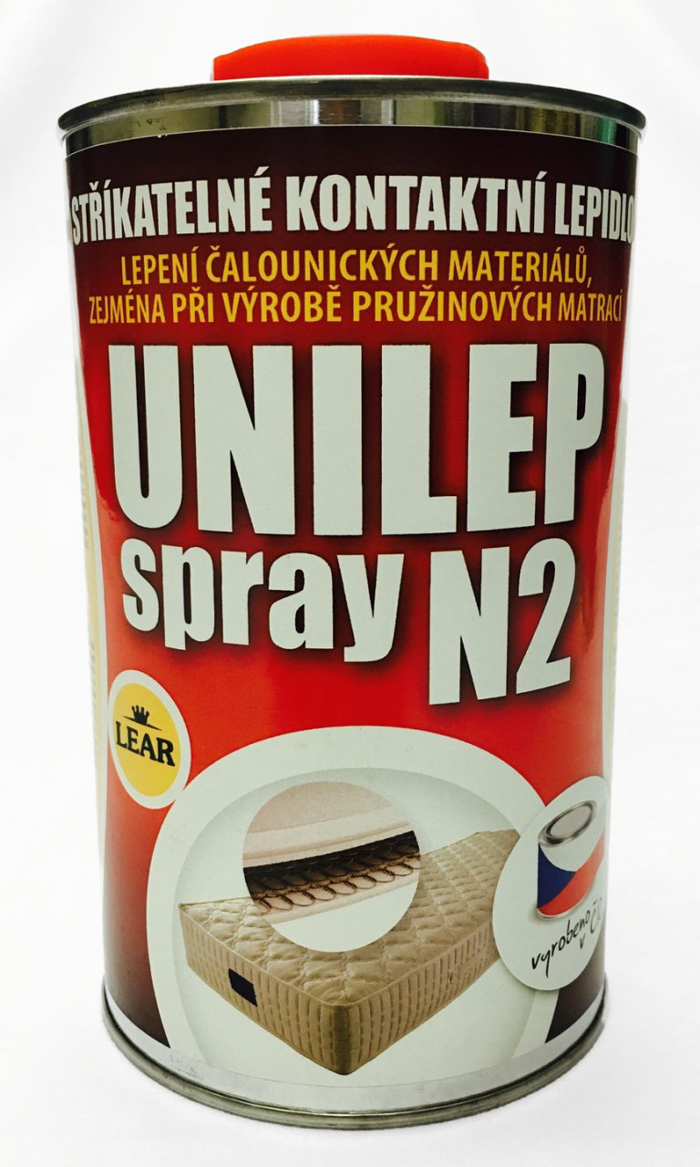 UNILEP SPRAY N2, striekacie kontaktné lepidlo. Vhodné na lepenie čaluníckych materiálov, najmä pri výrobe pružinových matracov. Unilep Spray N2 je kontaktné lepidlo pre jedno alebo obojstranné kontaktné lepenie čaluníckych materiálov (PUR peny, textil, drevo a pod.). Suchý film lepidla je elastický a vodovzdorný. Lepidlo obsahuje nehorľavé rozpúšťadlo. V ponuke balenia 0,8 kg, 3,5 kg.