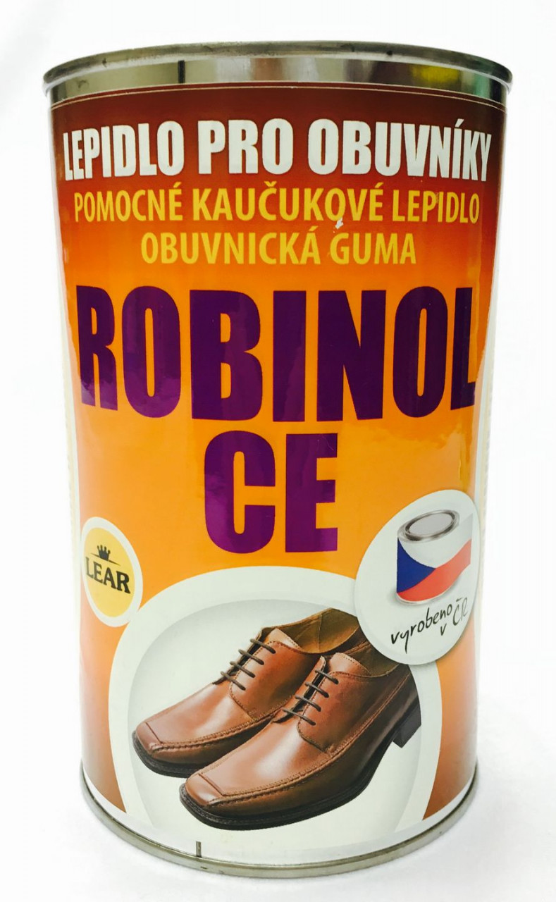 ROBINOL CE, lepidlo pre obuvníkov ( pomocné kaučukové lepidlo ). ROBINOL CE lepí kožu, gumu, PUR peny, textílie a papier. Vhodný na zaklepávanie kože a na čalunícke práce. Konečnú pevnosť dosiahne spoj po 24 hod. Spoj je pružný a odolný voči vode.